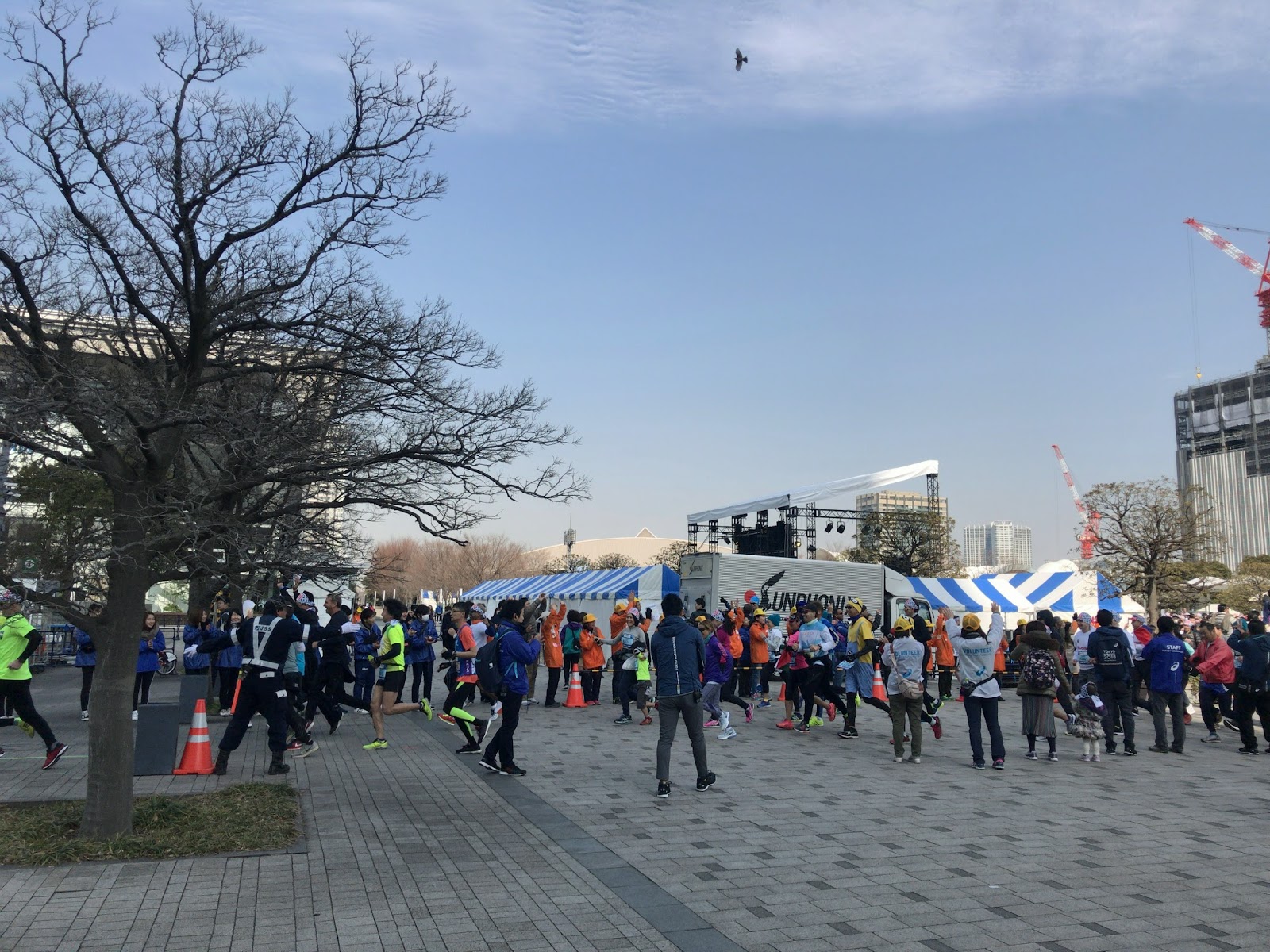 星期五晚上到東京,隔天早上我跟兩個朋友一起吃早餐然後往位在台場的EXPO地點Tokyo Big Sight前進。兩個朋友一個是利用週末來東京散心順便幫我們加油,另外一個朋友則是強運抽到東京馬,她說本來已經告訴自己除非抽到東京馬否則不打算再跑馬拉松了,結果就真的抽到。往Tokyo Big Sight的路上正好我們看到東馬前一天的5K Friendship Run的起跑,看到各式各樣變裝的跑者很有趣,本來我也想報名參加,但因為覺得盥洗太麻煩於是作罷。