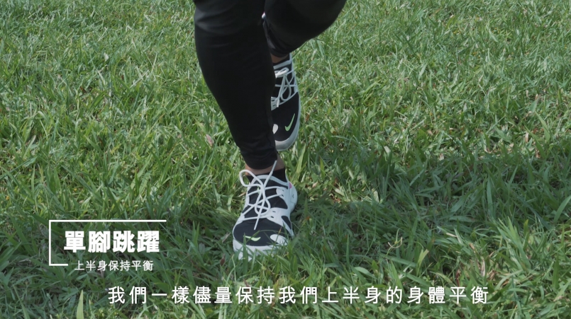 - 單腳跳躍:身體保持平衡,透過重心的前移或後移,感受足底肌使用的部位,此時你將可以感受到你的大腿、小腿、脛前肌以及臀部,都正在參與這個動作的訓練。