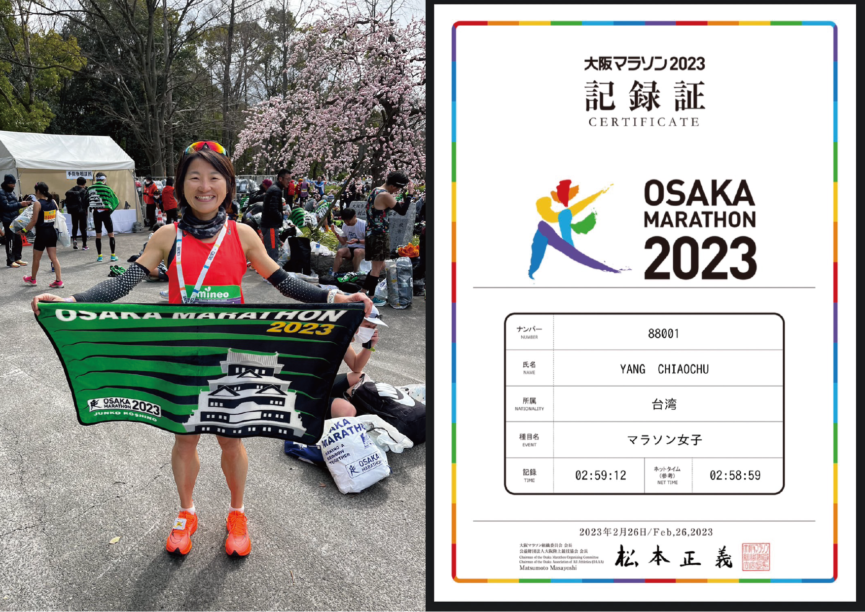正式破 3 的楊喬筑開心在會場攤開大阪馬拉松完賽浴巾拍照