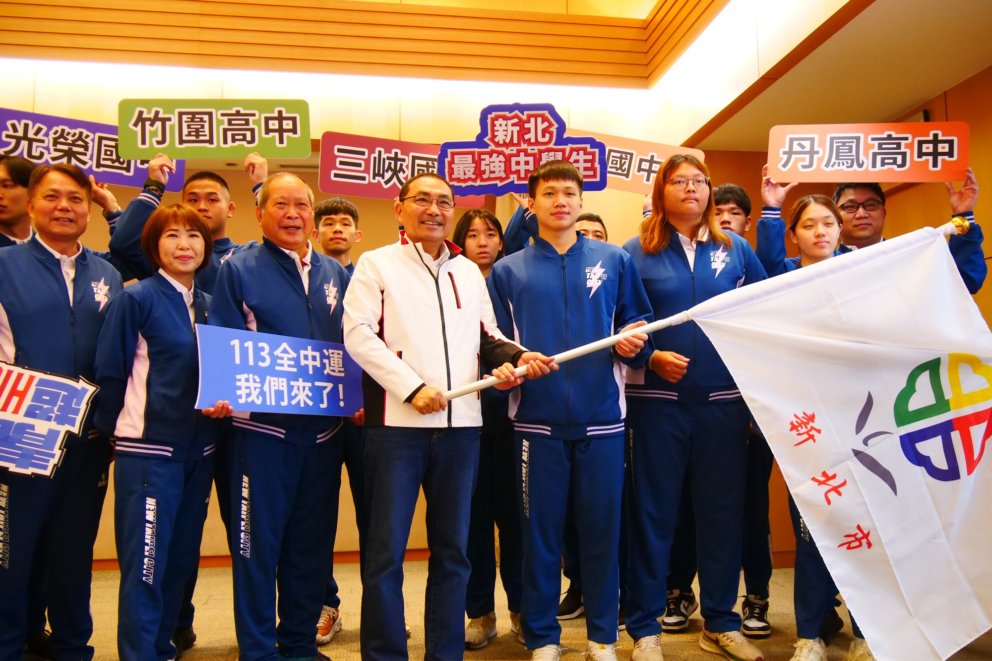 臺灣中學生運動競技的最高殿堂「113 年全國中等學校運動會」將於 4/20 至 4/25 在臺北市舉行,新北市代表隊於今(17)日市政會議舉行授旗儀式,由侯友宜市長授旗予標槍明日之星三重高中選手黃潮鴻,領軍新北代表隊 101 所學校超過 1,400 名選手出戰,侯市長勉勵大家堅持永不放棄,勇於展現自己創造佳績。