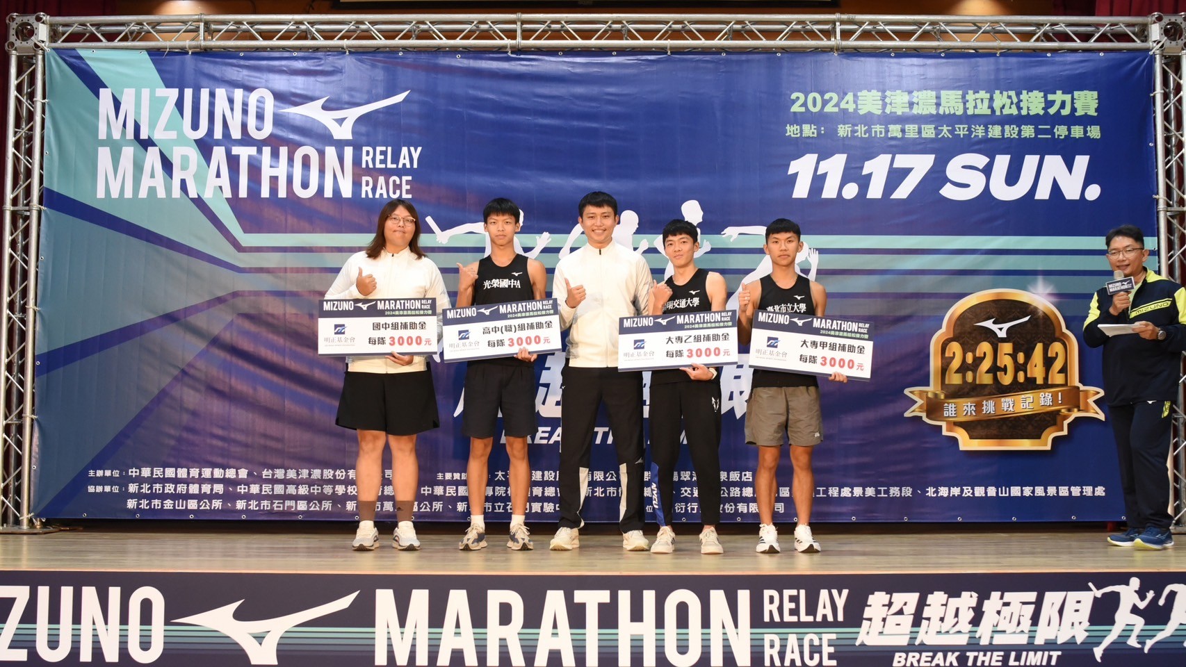 長期支持學生運動不遺於力的明正基金會 ,為鼓勵學生們積極參與「2024 MIZUNO 馬拉松接力賽」,今年也將持續提供學生組(大專甲組、大專乙組、高中(職)組、國中組)贊助每隊 3000 元的補助金,大會也會依交通距離給予高中組及國中組交通補助,用實際行動支持學生運動的發展。