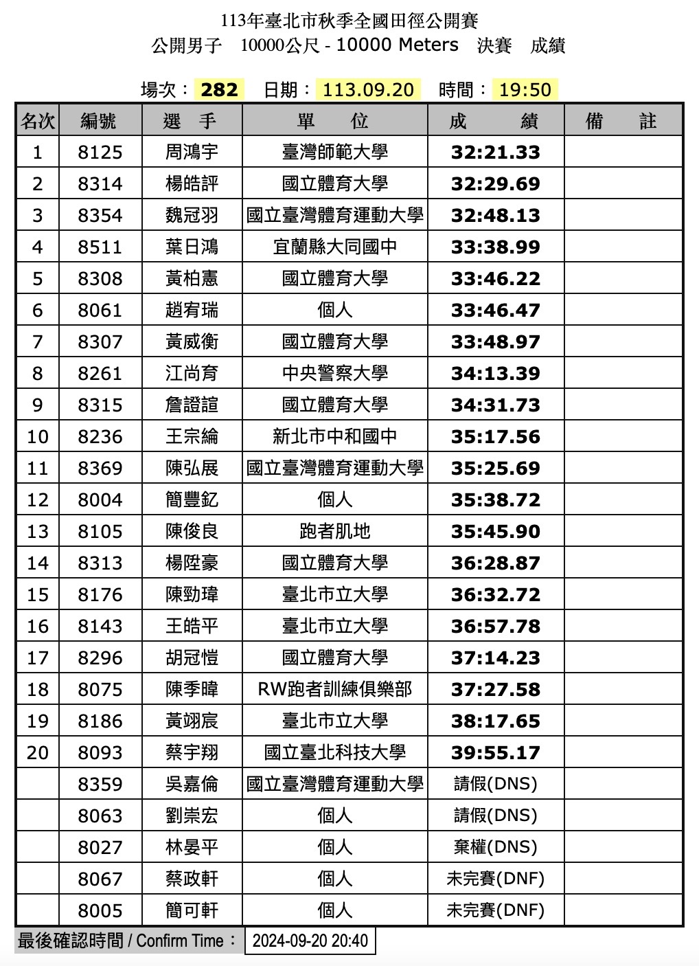 ❏ 113 秋季盃公開男子一萬公尺賽後成績: