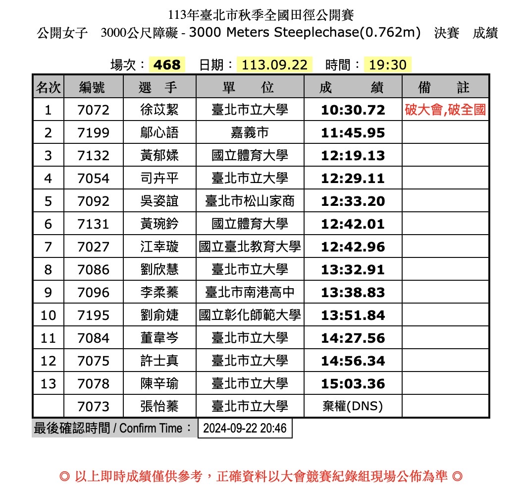 ❏ 113 秋季盃公開女子三千公尺障礙賽賽後成績: