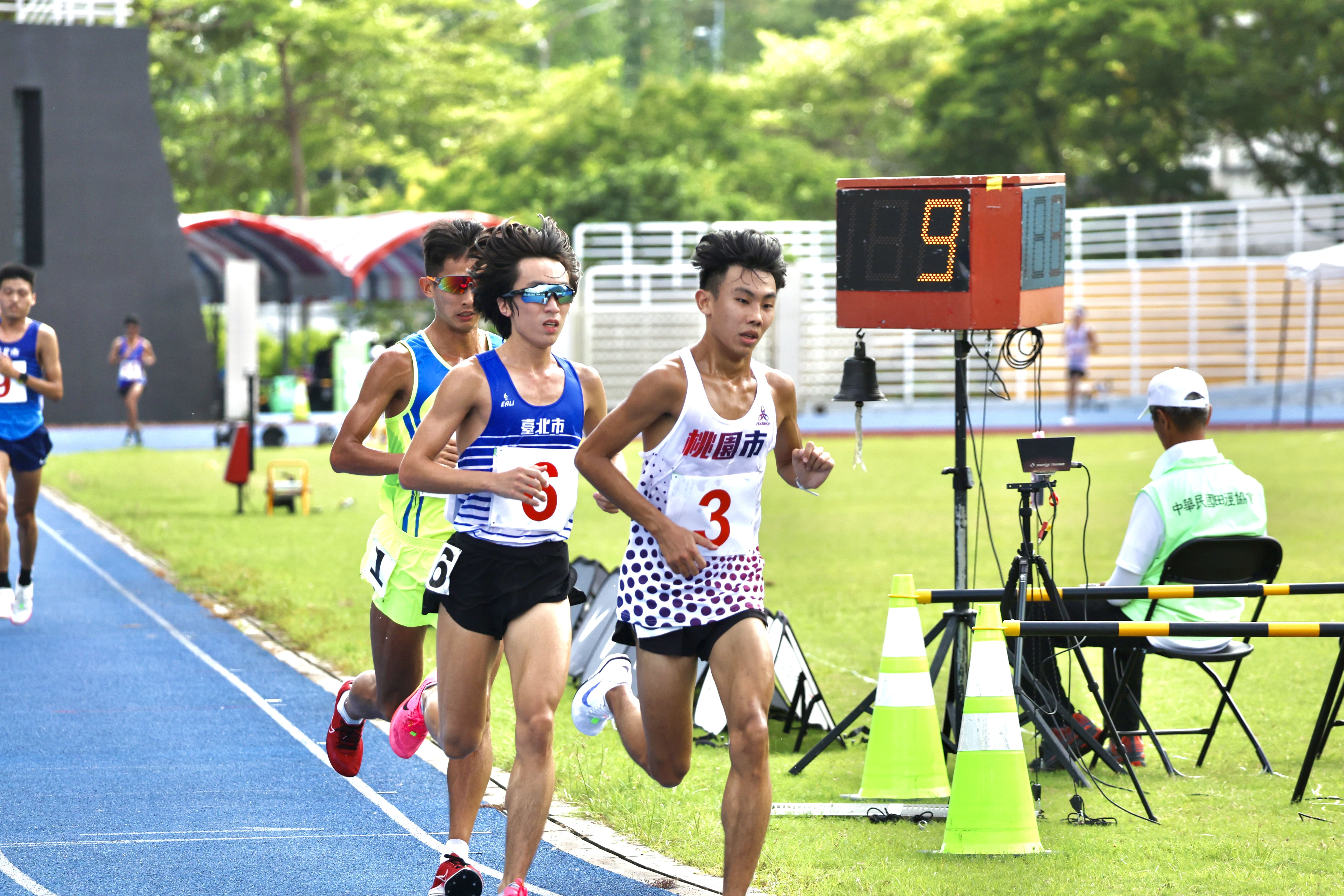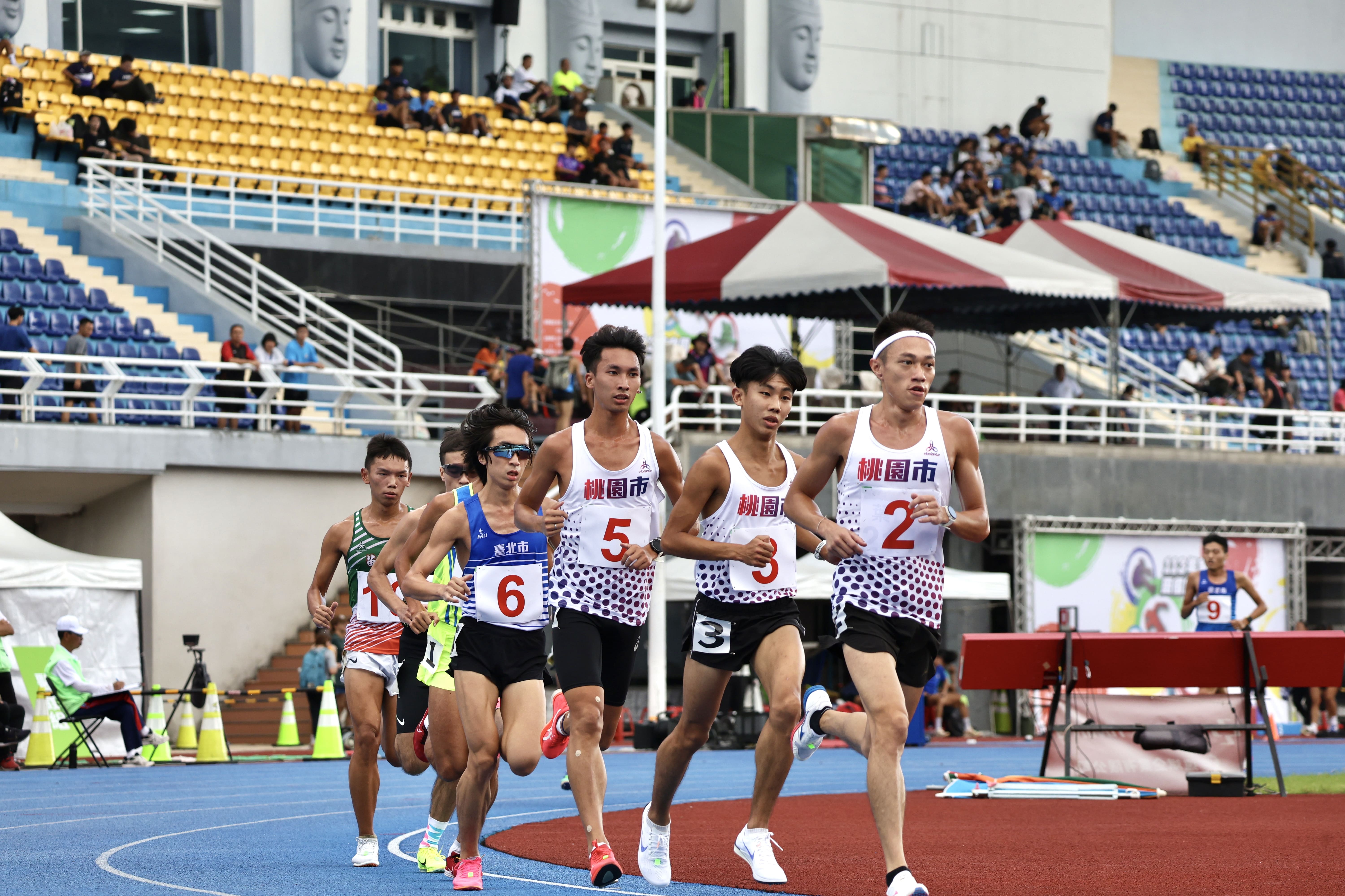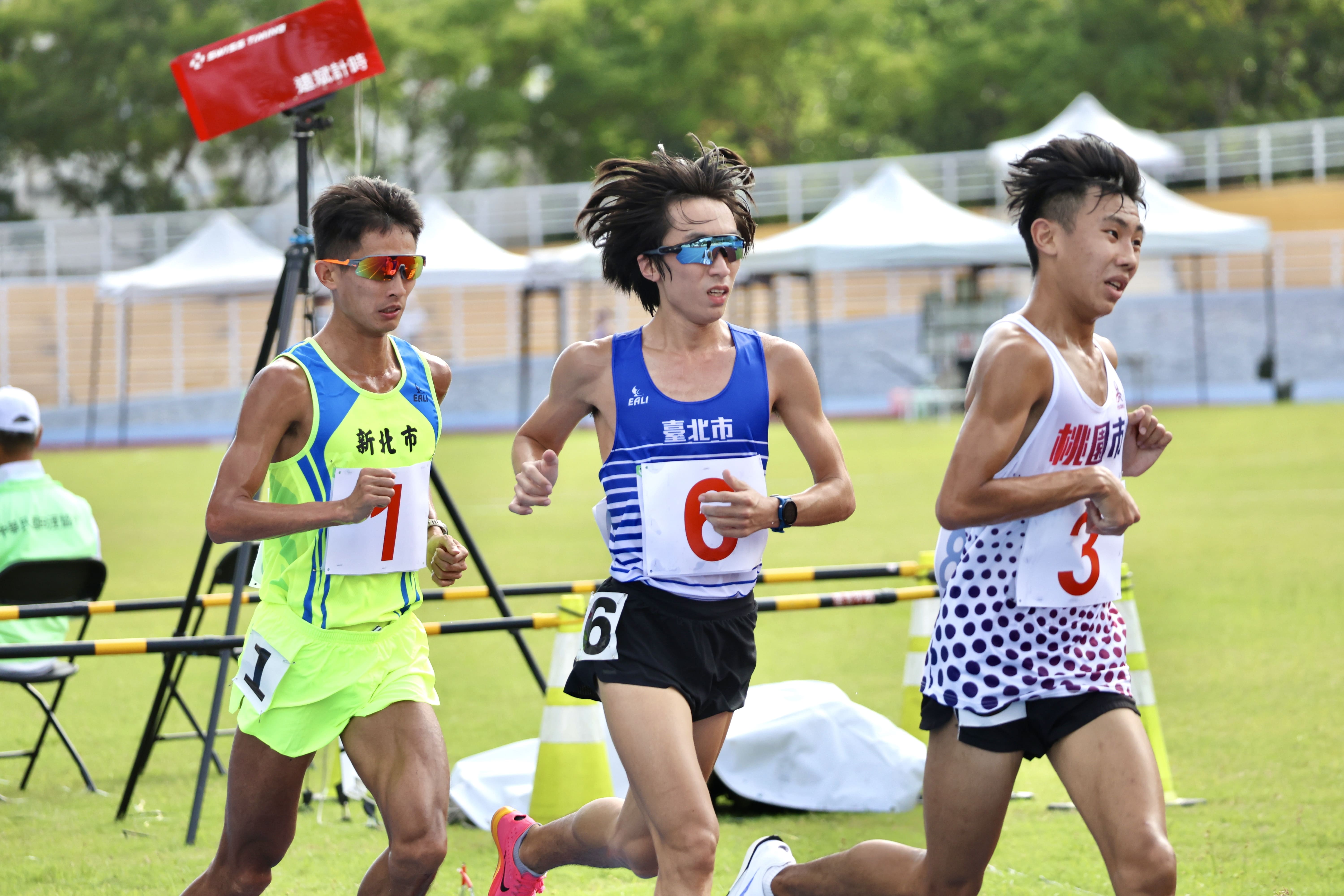 今天的天氣較為炎熱,太陽公公很有精神,下午 14:20 分,公開男子 10000 公尺決賽正式登場,由周庭印 封王、黃柏憲 第二、魏冠羽 第三。