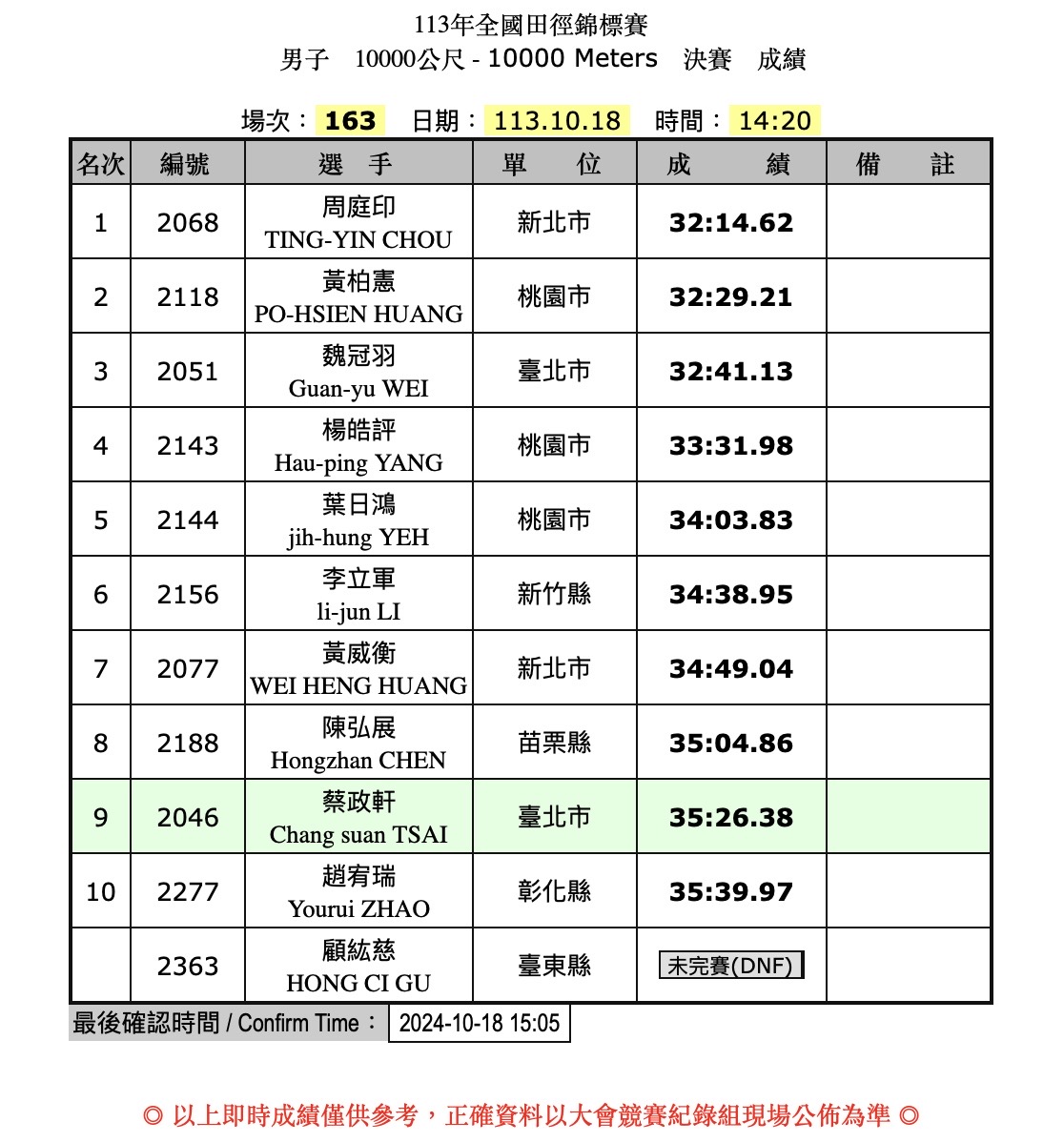❏ 113年全國田徑錦標賽公開男子一萬公尺賽後成績: