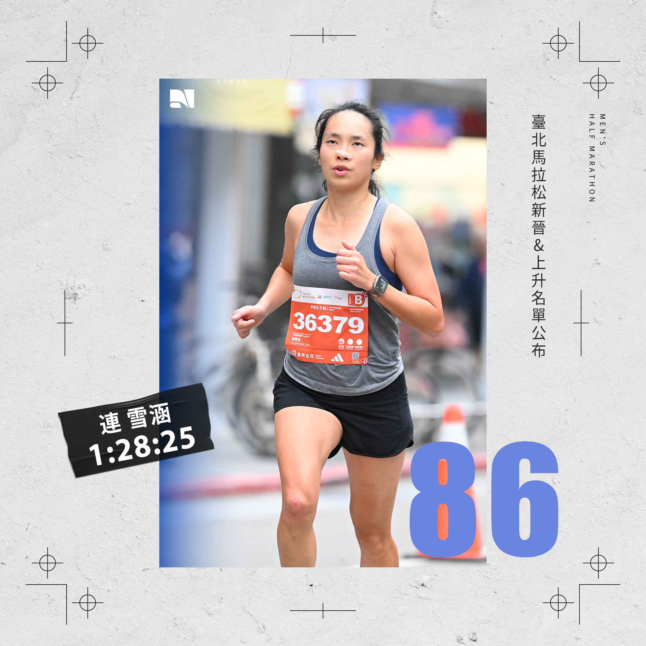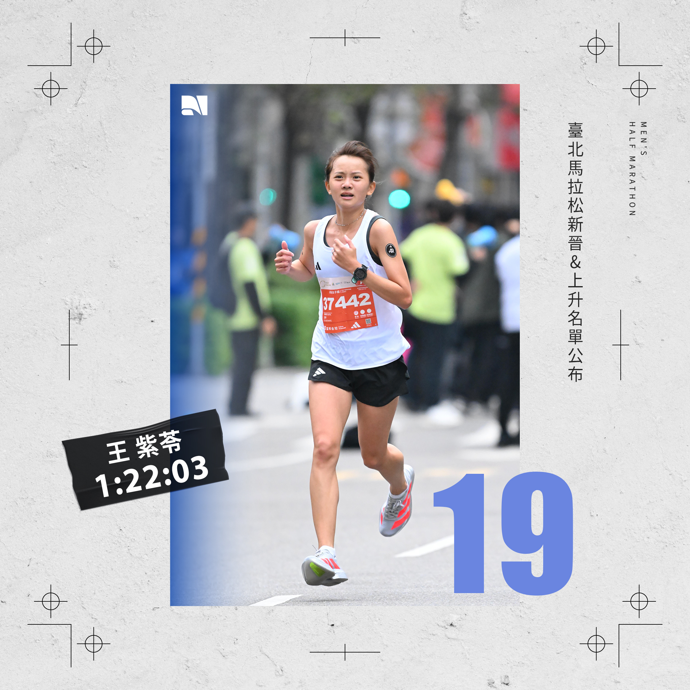 本次新晉百傑中,來自國立體大四年級的 王紫苓 以 1 小時 22 分 03 秒通過終點,過去都以中距離為主的她,這次嘗試挑戰半程馬拉松,就繳出相當不錯的成績,也讓她成為新晉歷代百傑第 19 位。