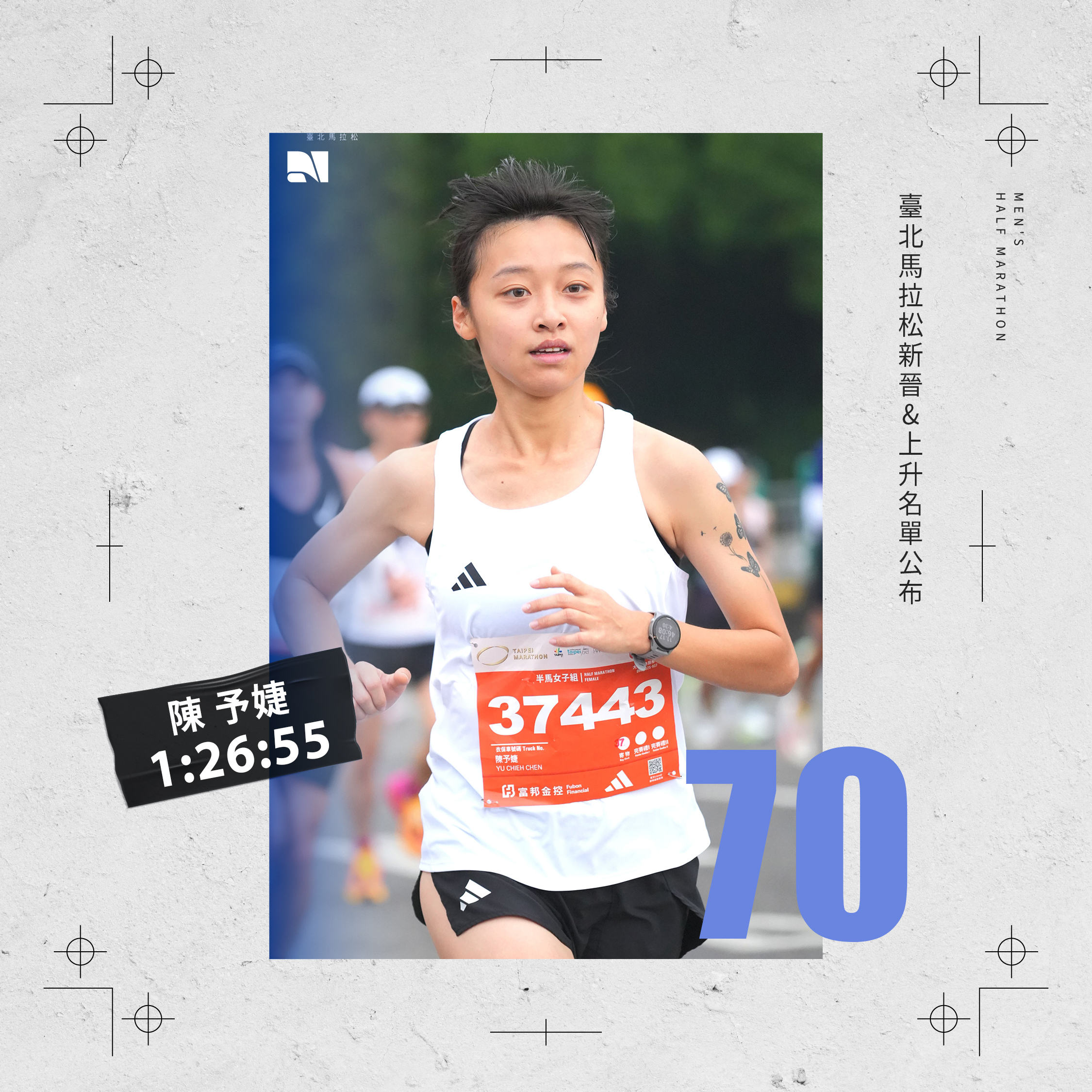 余亭緣 則以 1 小時 23 分 52 秒完賽,刷新了九年前的個人最佳,向前邁進了 2 分鐘,也幫助她在上升至歷代百傑第 39 位。