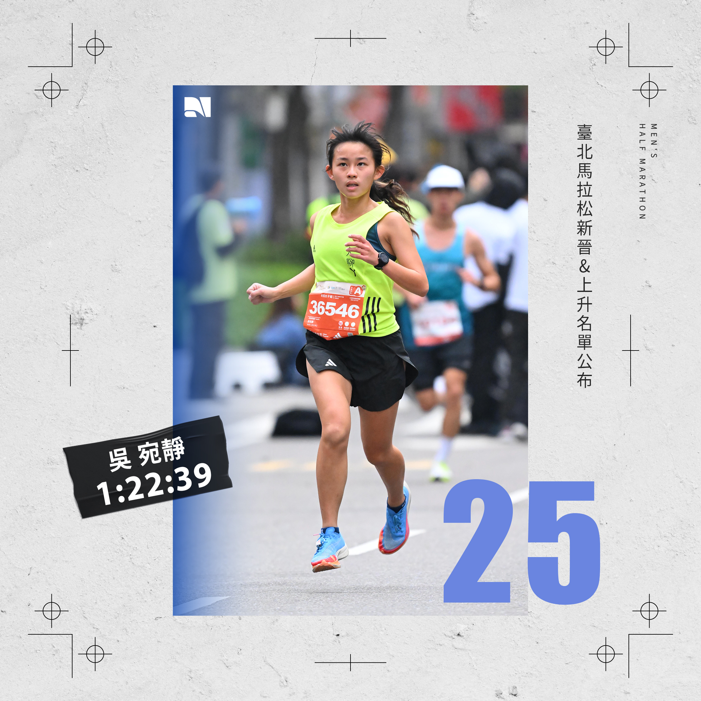 19 歲的 吳宛靜 再次跑出不俗的成績,去年在臺北馬跑出 1 小時 23 分 41 秒,改寫臺中市紀錄,也讓她成為 U20 歷代第 8 位,並登上全國歷代第 34 位,這次再將個人最佳向前推進 1 分鐘,再次刷新個人最佳、臺中市紀錄,也讓她從 U20 歷代第 8 位上升至歷代第 4 位,全國歷代則來到了第 25 位。