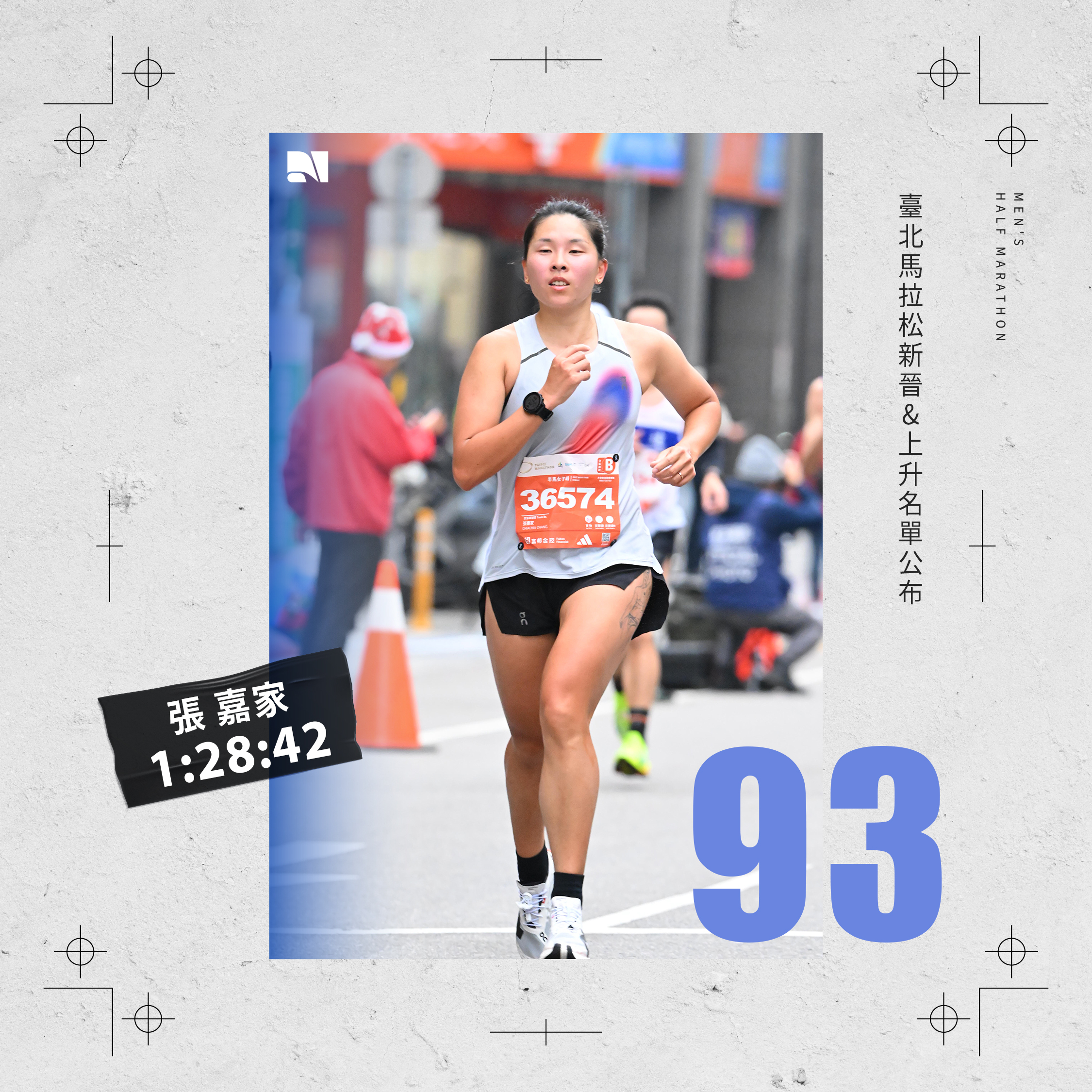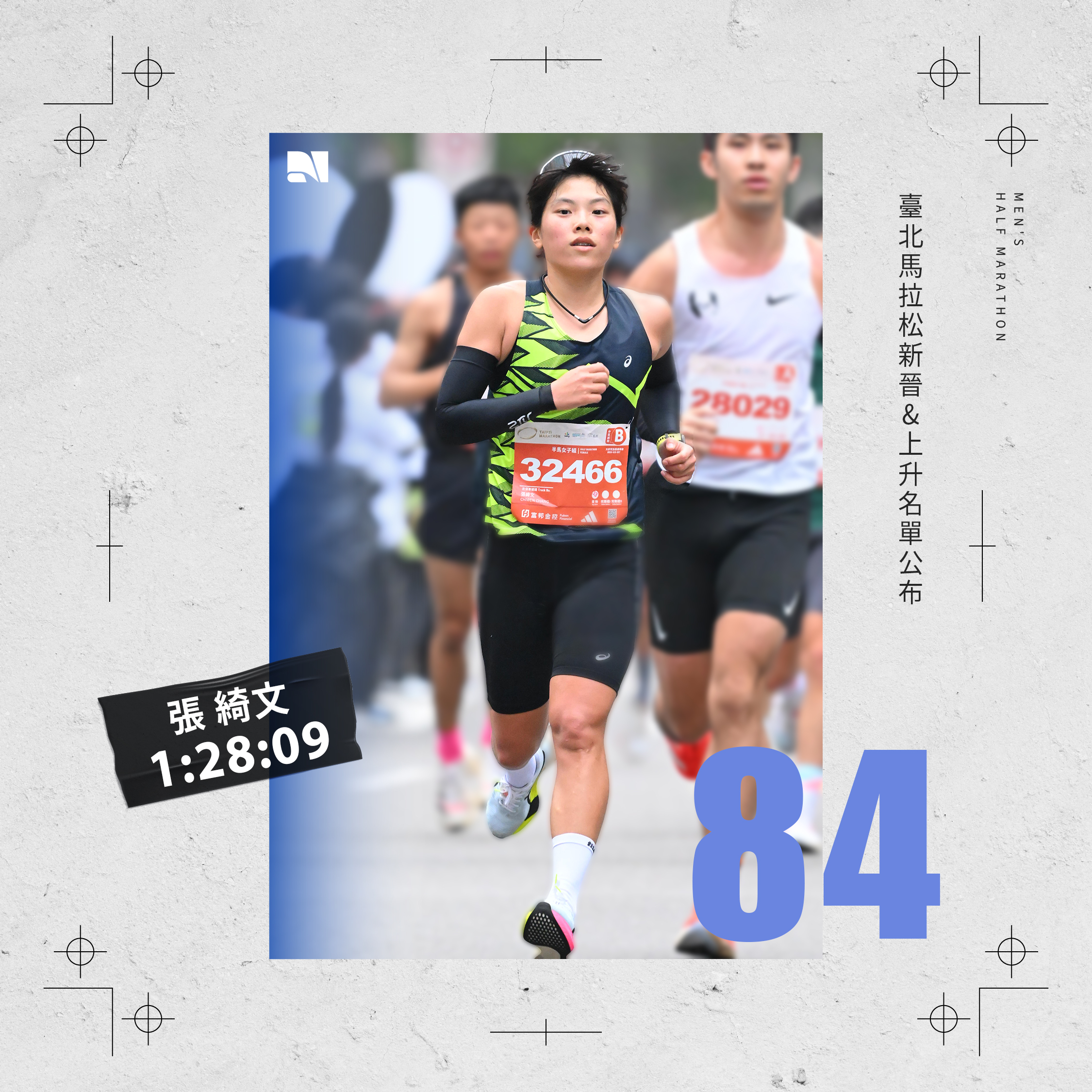 臺灣首位入選世錦賽總決賽的鐵人選手 張綺文,也來挑戰她的首次臺北馬,儘管腳踝還並沒有完全恢復,但她仍以 1 小時 28 分 09 秒通過終點,成為新晉歷代百傑第 84 傑。也期待綺文能夠前進 2028 洛杉磯奧運,登上鐵人奧運舞台!