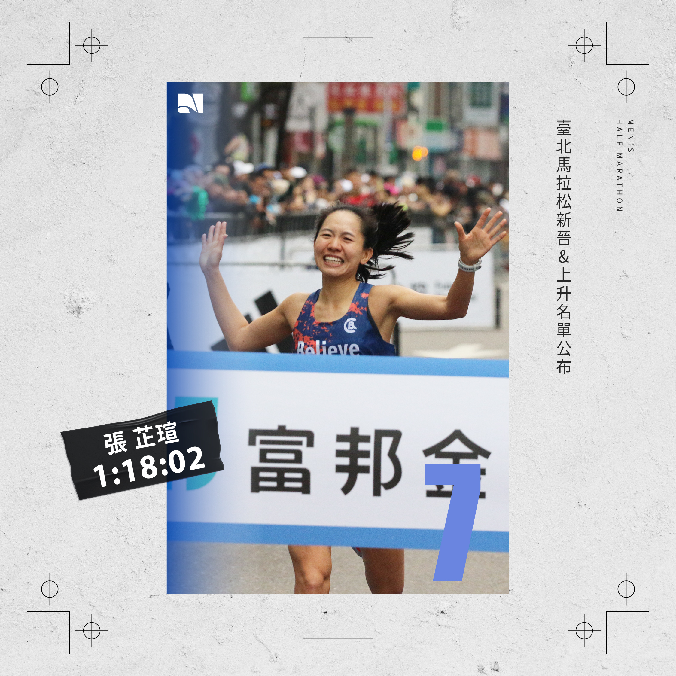本次拿下半馬女子第一的「長跑甜心」張芷瑄,以 1 小時 18 分 02 成功改寫了今年在中國揚州半馬中所創下的 1 小時 18 分 37 秒,由於才剛結束南京馬拉松,原本只是打算調整狀態,卻意外發現自己狀態不錯,在後段開始追逐時間下,將個人最佳成績再往前推進,也讓她上升至歷代第 7 位。