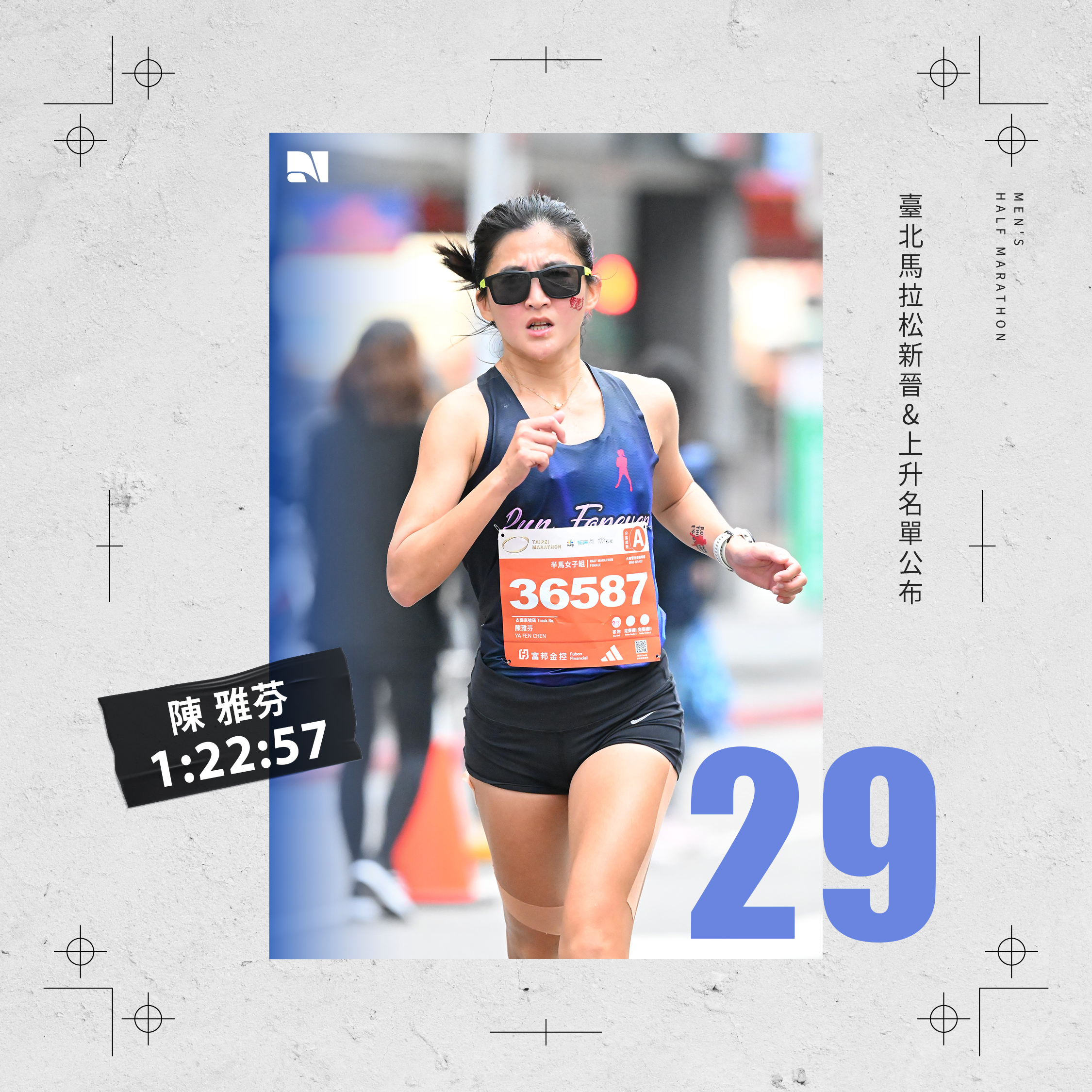 「萌少女」陳雅芬,歷經四年跑出 1 小時 22 分 57 秒再次刷新個人紀錄,也讓她上升至歷代第 29 位。賽後,她也在社群分享道,「這次目標明確鎖定用每公里 4:00 至 3:55 的配速,除了 1 公里稍快及 19 公里慢了,其餘都守住這次的目標。」她也表示,並不滿足於此,知道自己的方向是正確的就會繼續努力下去。