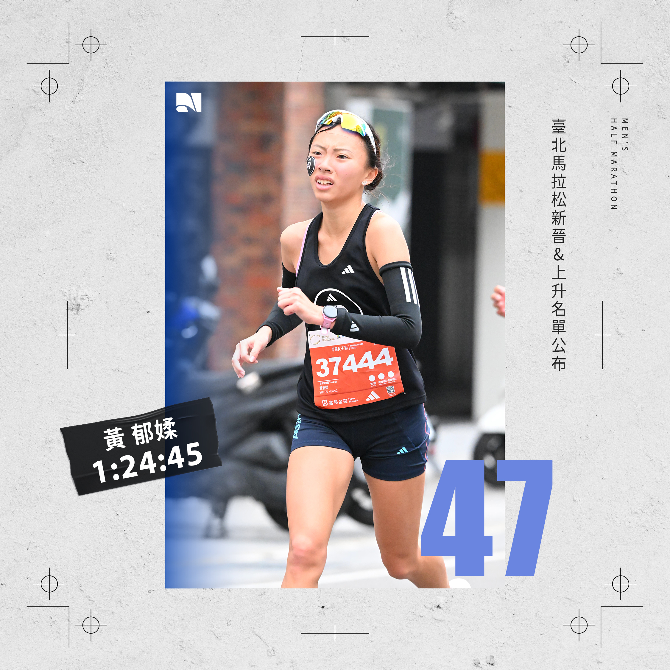 來自國立體大的 黃郁媃,今年年初在香港渣打馬拉松半馬中跑出 1 小時 27 分 56 秒拿下總排第四名,這次臺北馬中,她以 1 小時 24 分 45 秒刷新去年臺北馬時所創下的個人最佳,讓她上升至歷代第 47 位。初馬就進百傑的媽媽跑者 李惠娟,今年挑戰半馬,並以 1 小時 25 分 52 秒刷新自己的個人最佳成績,上升至歷代第 60 位。國立體大 陳予婕 則跑出 1 小時 26 分 55 秒刷新去年臺北馬所創下的個人最佳,由歷代第 74 位上升至歷代第 70 位。