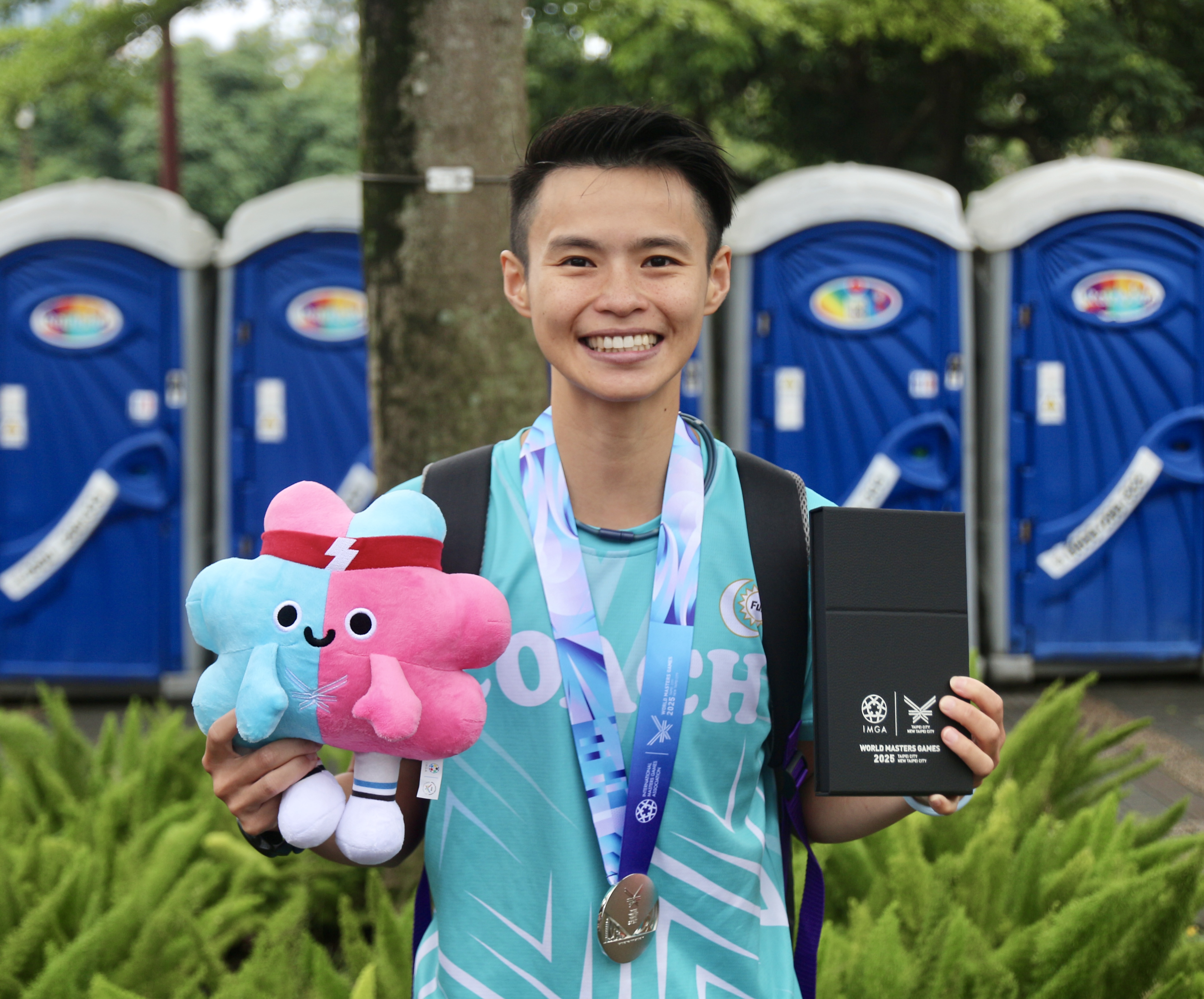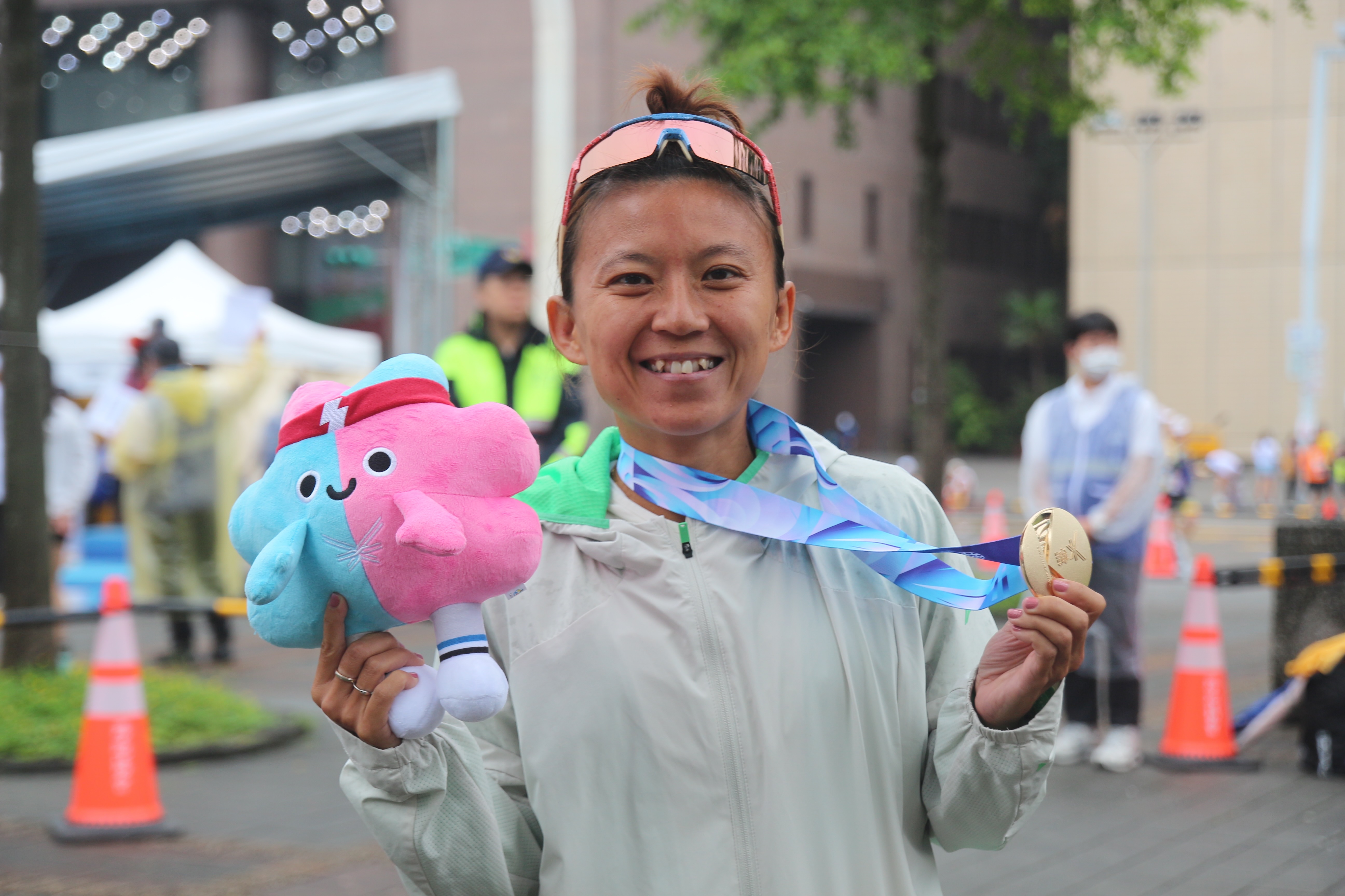 蘇蘇拿下女子 30 歲組分排第一以及女子總排第一,賽後拿著世壯運吉祥物壯寶開心合照。圖|口口呂攝