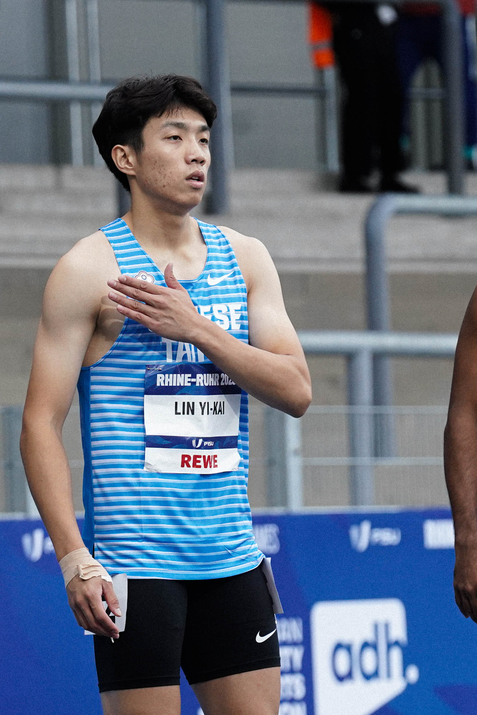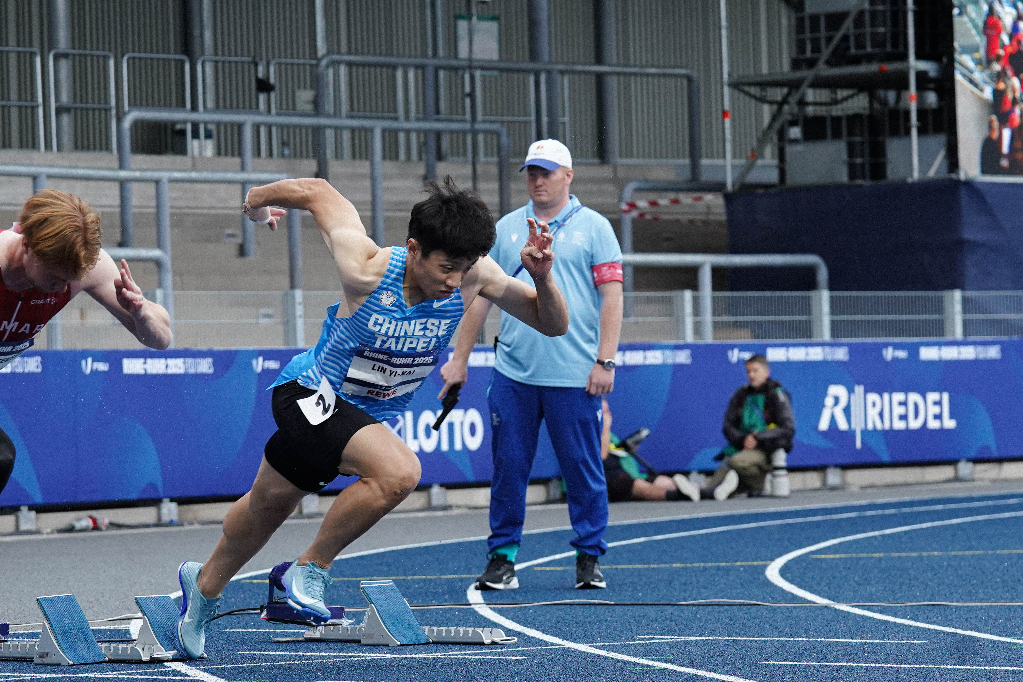 首次來德國萊茵魯爾這個場地比賽,他分享道,「這個場地和我原本想像的不太一樣,它的跑道只有八道,感覺比一般更擁擠,跑的時候好像隨時會碰到隔壁的選手。」