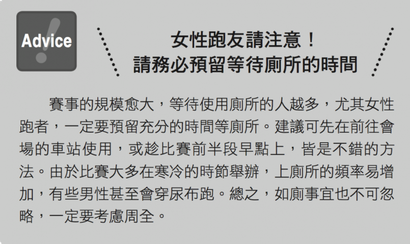 | 上廁所 | 有些會場有架設臨時廁所,但多數情況的廁所都很少。大排長龍時,要注意不要離起跑時間太靠近。 | |