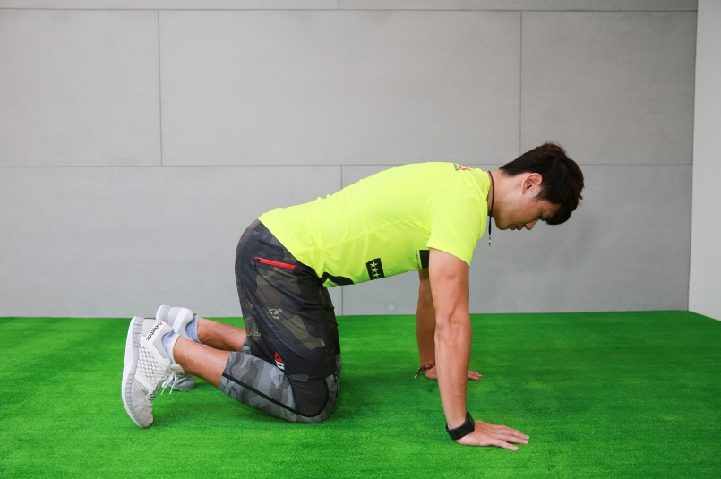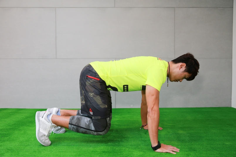 四肢跪地,手臂放置於肩膀之下,膝蓋緩緩離地;身體、大腿、小腿和足背呈 3 個直角(圖片來源:運動筆記)