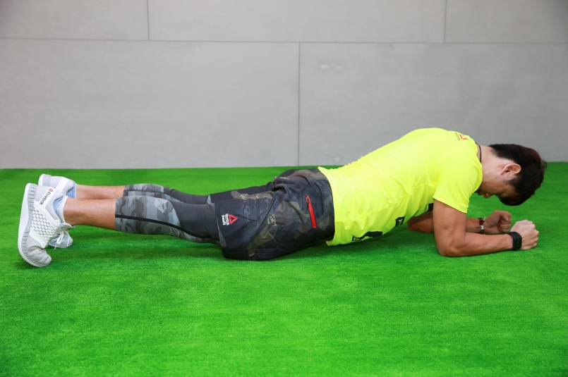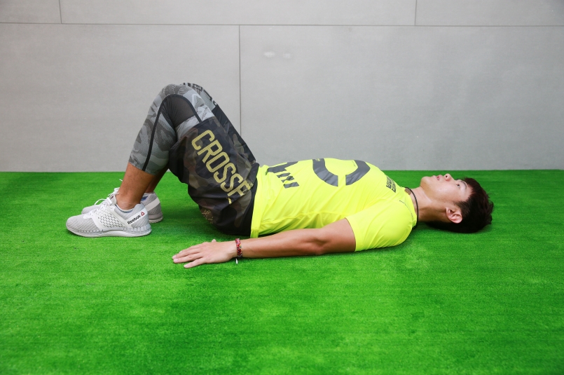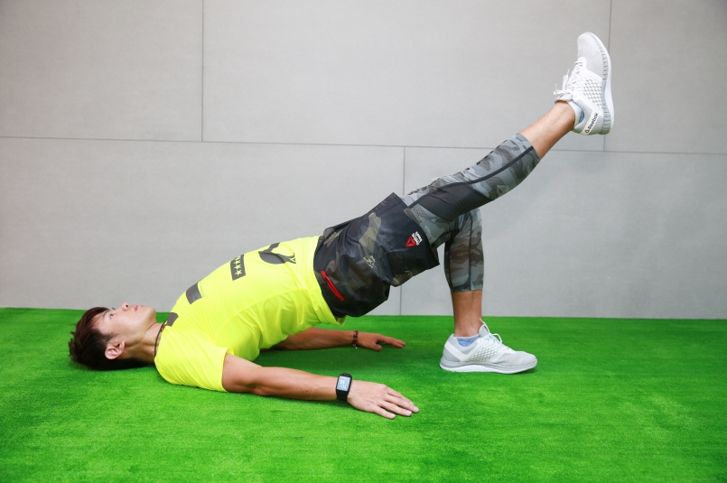 - 從臀部開始慢慢將身體抬起,直到臀、背、肩膀呈一直線為止