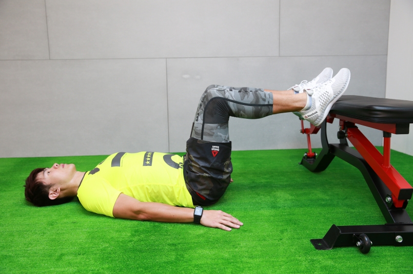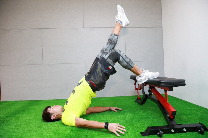 - 用腹部的力量將臀部抬至最高點,上半身挺胸夾背