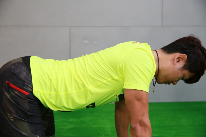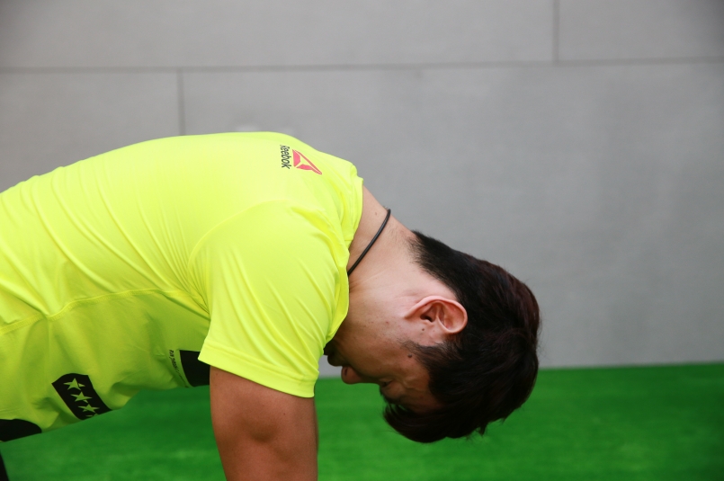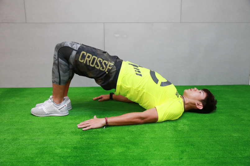 - 從臀部開始慢慢將身體挺起,直到臀、背、肩膀呈一直線為止