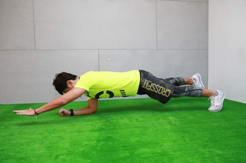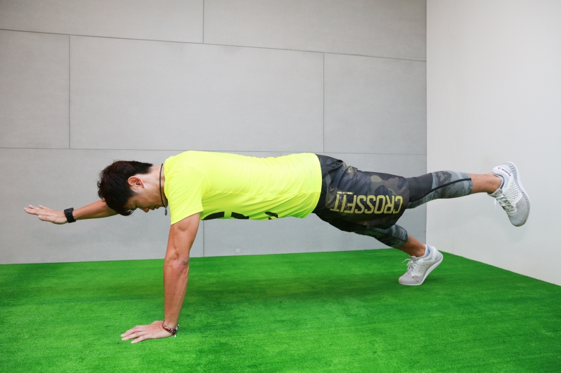 - 抬起右手臂並伸展左腿,與身體呈一直線