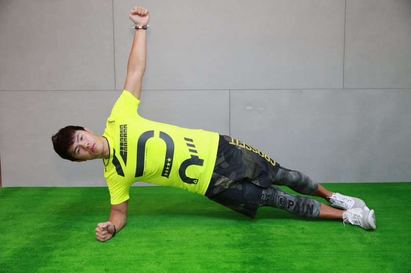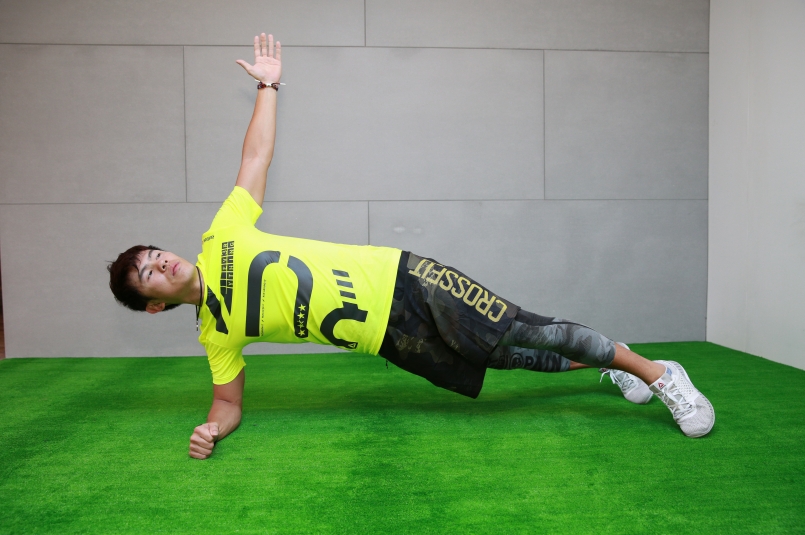 完成動作:身體平行像上旋轉,手臂往天花板方向延伸(圖片來源:運動筆記)