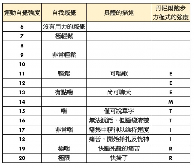 運動,其實是個聆聽自己身體聲音的過程,跑步的強度,身體自然會告訴你。「運動自覺強度」由瑞典 Gunnar Borg 學者提出,是一個有信效度而且行之有年的強度分級方式。共有 6–20 的分級, 6 是指完全休息不動, 20 則是極限(如以下表格)。簡單說明如下: