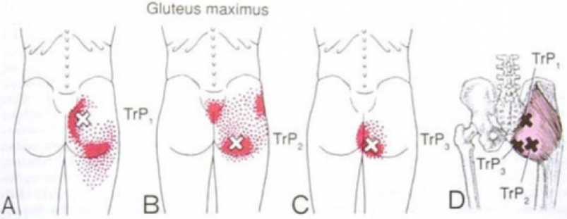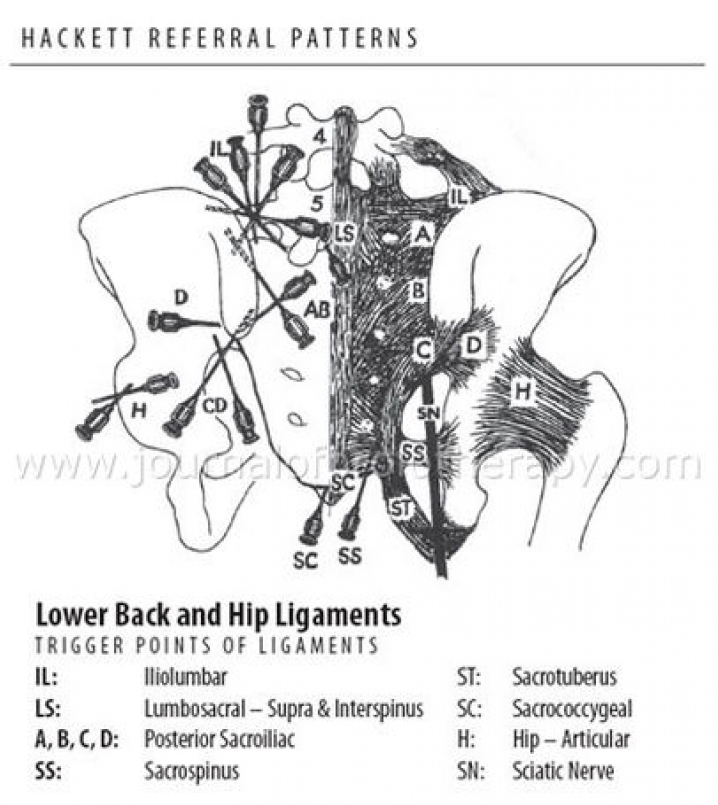 增生療法來說,最具臀大肌代表性的是 Hackett D 點。臀大肌的筋膜在這裡,跟一片「後薦髂韌帶」融合,薦髂韌帶又跟薦髂關節、髂腰韌帶、腰椎第四五節、薦棘韌帶、薦凸隆韌帶,全都難分難捨,加上這裡的神經(上臀神經、坐骨神經、後股皮神經、會陰神經等)如果也受到壓迫,症狀更是明顯。