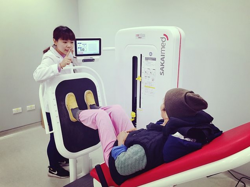 針對老年人,常常無法從椅子上站起來,通常也有臀大肌的問題,可以做「能力回復復健」 ,這台「水平推蹬機」就是針對臀大肌,模擬從椅子上站起來的動作。