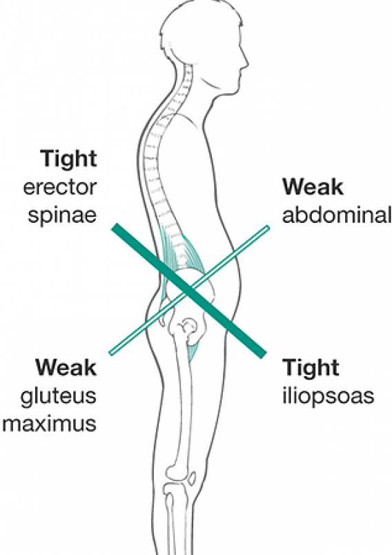 - 腰痛(下背痛):用豎脊肌代償。又跟「下交叉症候群」有關,臀大肌無力會造成骨盆前傾(尤其核心又無力者),足弓也容易塌陷,形成所謂的「假性扁平足」,身體真是牽一髮而動全身啊!