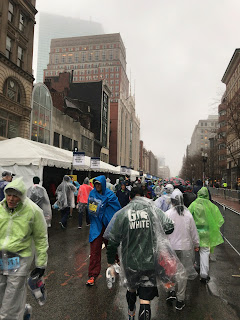 隔天起床看著窗外下著大雨,心裡有點忐忑,賽前官方有傳電子郵件說雖然氣象預測是下雨,但新英格蘭天氣多變,還是可以期待跑步當天有變數。結果出爐:天氣比預測更差><,除了雨大風也大,氣溫還很冷,我都覺得快要跟我二月初去北海道的體感溫度差不多了,如果是在台灣報的半馬賽事遇到這樣的天氣我應該會果斷棄賽,但這可是波士頓馬拉松怎麼可以放棄,只能告訴自己就跟玩遊戲一樣,最後一關總是特別難。