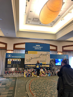 拿完號碼布,再來我要完成另一個任務,因為這是我六大馬的最後一場,在跑完東京馬後我有先寫電子信給世界馬拉松大滿貫協會Abbott World Marathon Majors,官方確認我的資格後有回信請我去EXPO那天到他們攤位報到,在攤位他們核對我的身份之後,在我的號碼布貼上一個小貼紙,到時抵達終點後憑貼紙就可以領取六大馬波堤獎牌。此外他們還發了一個像號碼布的東西,上面寫著我今天會完成六大馬,讓路旁群眾看到可以幫你打氣(後來因為下大雨路跑全身包緊緊加雨衣根本看不到號碼布)。領完之後我拜託攤位的工作人員幫我拍照,結果她除了用我的手機拍,還用他們的ipad幫我拍了張照上傳官方推特,特別的是她拍完照再編輯的時候還請我選擇台灣的國旗圖示,本來很擔心找不到台灣國旗該怎麼辦,還好系統很貼心沒有把台灣國旗漏掉。
