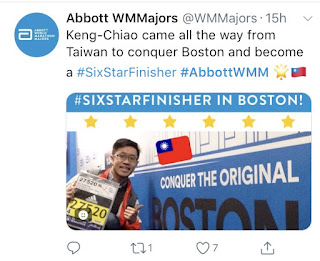 比賽前一晚不知道是不是要迎接六大馬最後一場太興奮,雖然這次時差在洛杉磯調得不錯,但這晚一直到兩點多還睡不著,剛好看到運動筆記貼文說目前台灣有五個人完成六大馬,到倫敦馬拉松會至少還有三個人達標,不過其實波士頓馬拉松LINE群組有統計過,光這次波馬參加的台灣人連我在內會再有七人完成六大馬(甚至有一位強者是從去年倫敦馬開始連續六場六大馬直接在今年波馬達標),台灣六星跑者人數會正式進入兩位數,我想未來這個數字一定累積愈來愈快吧。