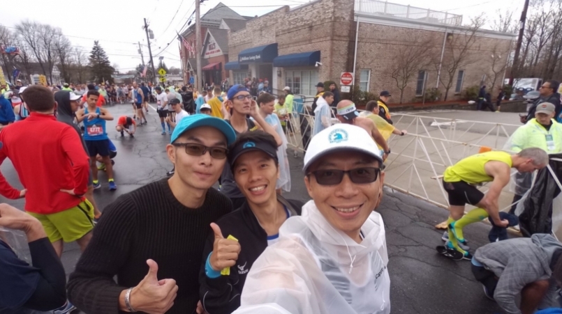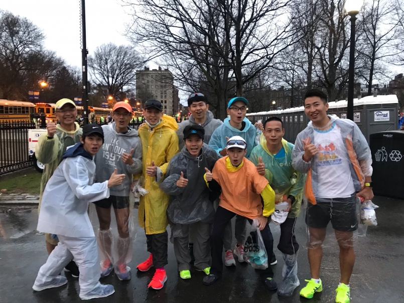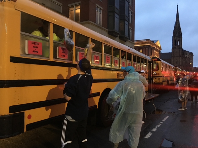 清晨5點,大夥集合拉車前往波士頓市中心(終點附近)進行報到寄物,然後坐官方的接駁車(校車)出發前往起點,途中雨勢越下越大,窗外只能看到磅礡大雨,看不到其他景色,不過有鑒於去年冰霜獨角獸的殘暴虐殺,今年大家都充分準備雨天裝備,像是防水雨鞋套、半身雨衣、保暖衣物等…