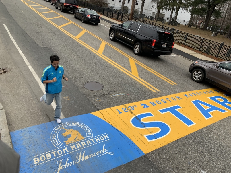 第2天行程從紐約拉車前往波士頓,路途恰好經過波士頓賽道,我們來到了賽事起點「Hopkinton小鎮」,一下車看到起點線整個人開始興奮起來,儘管道路還沒開始交通維持,但很多人還是忍不住跑到路中間拍照,汽車駕駛也都很好心的停下來..