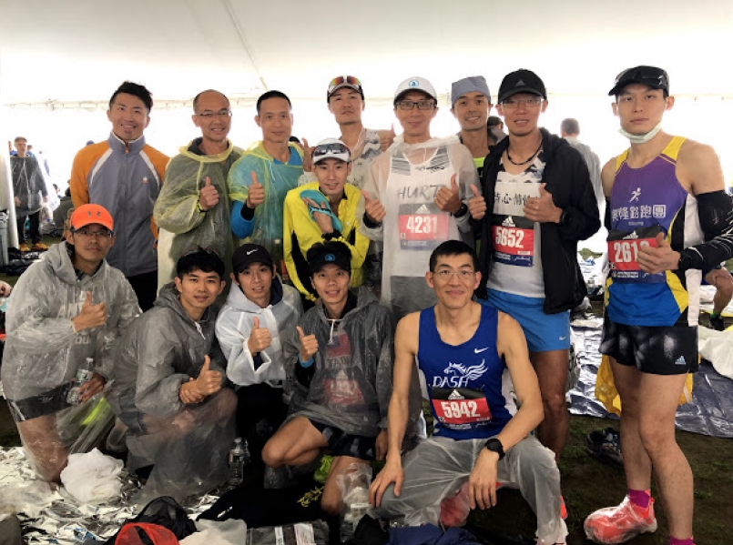 我們算早到的,草地上還有一些空位,鋪上鋁箔毯坐著一起聊天,周圍有免費咖啡、貝果與香蕉可以補充體力,大夥聊著聊著時間一下子就過了,也認識一堆朋友 : 歐陽中和(綜藝哥)、黃世昌(68傑哥)、林國翔(神似宇豪哥)、吳展好(大手筆哥)、黃修懿(249哥)、蔡昇孝(艾哥)、陳逸群(霸哥or群妹?)、曹銘原(炒麵哥)、鄭硯豪(抽稅哥)、蔡榮總(冷面笑匠哥),因為都愛跑步,所以有話題都聊不完…這就是跟團的好處呀!! 後來也是LINE群互相打屁的朋友..