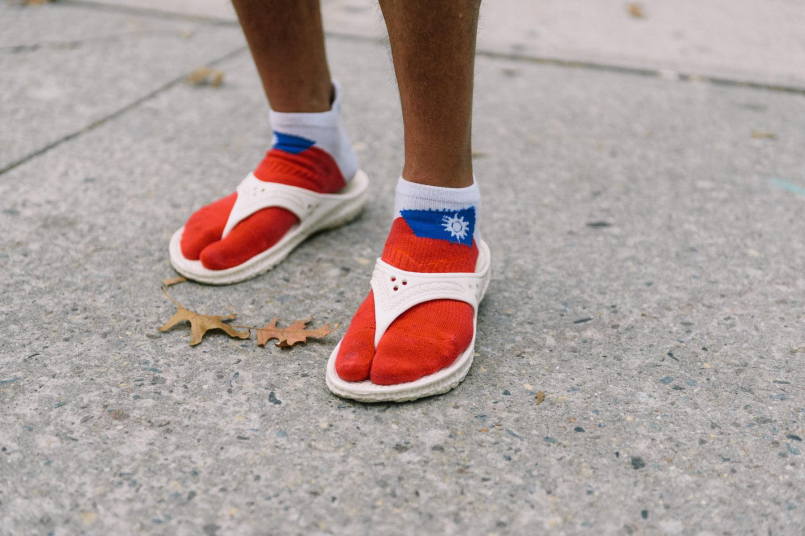 羅維銘換上國旗圖案的二趾襪和白色蚵技神速y拖,做為迎接衝線的最後一套戰靴。