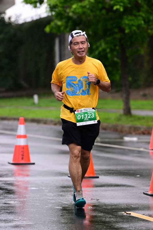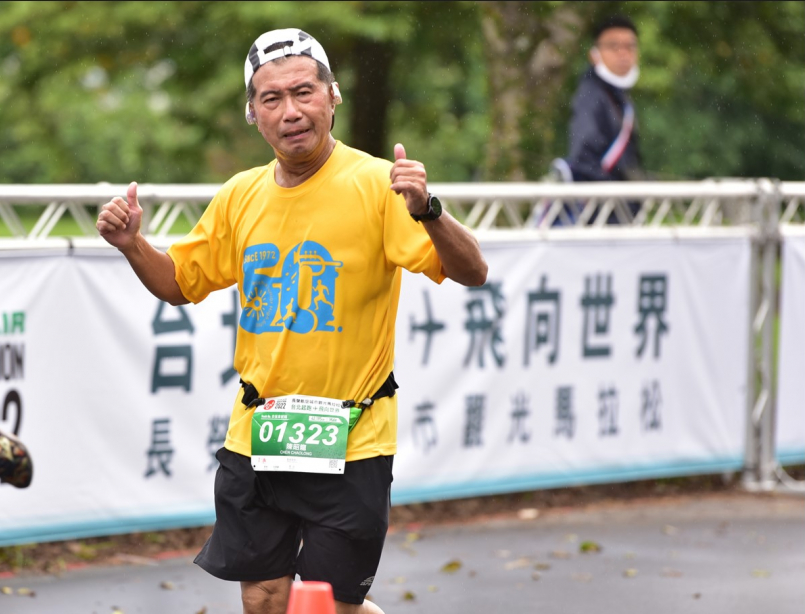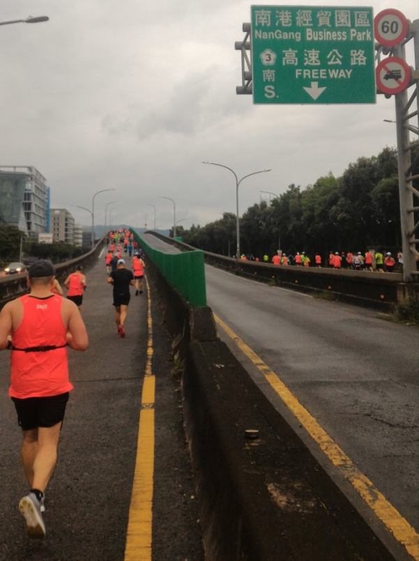 氣象預測10/23因受颱風外圍環流影響,北部地區會有局部大雨發生,果不其然,10/22晚上6:00左右台北便開始下起大雨,我也做好雨中路跑的準備,穿五指襪,腳蹬ㄚ拖,全力以赴,一定要在6小時內「壓線」完賽(此場賽事完賽時間為6小時,比一般全馬賽事提早半小時關門),以免影響我的「百馬達陣」計畫。