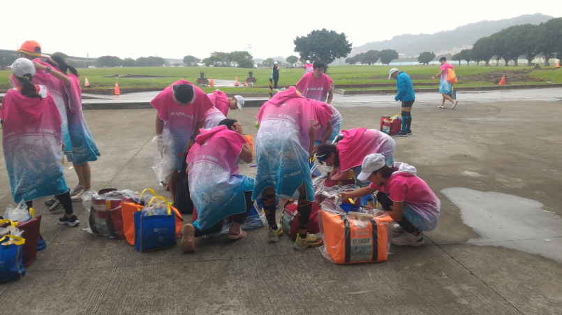 此場賽事遇見兩位馬場的好友,一位是明志科大劉祖華校長,一位是百馬健將陳復助兄,在這大型賽事的茫茫人海中相遇真是有緣,一起合照並相互加油打氣。此場完賽禮著實讓我驚艷!餐盒是長榮空廚製作的飛機餐與100%純鳳梨汁,再加一包瑞穗鮮乳土司,真可飽餐一頓。這一樣完賽禮最是特別,就是長榮馬專屬「斗蓬」,因為材質是布料,所以拿到手時以為是「運動浴巾」,走到休息區時看見好多人套上印有42K賽道路徑圖樣的外衣(見圖),再看手上拿的「浴巾」圖樣,此時才知道原來手上拿的不是「浴巾」而是「斗蓬」(不過當浴巾也蠻合適的)。惦惦手上拿的餐盒與完賽禮,還有賽前物資贈送的馬拉松專用衣保袋,參加此場賽事真是物超所值,大企業辦活動就是不一樣。