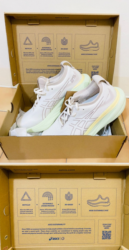 一打開ASICS GEL-NIMBUS 25盒子時,我簡直想大喊:「welcome to the new world~」一入眼簾的是厚實中底,圓潤修邊手法,讓跑鞋變得更加有親和力。ASICS將關於跑鞋的減碳故事都印刷在鞋盒內側,讓跑者在開箱時都能夠知道多一點關於ASICS對環境保護的用心。