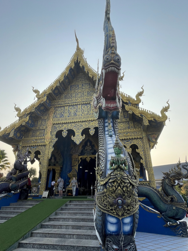 參觀完大麻園和鳳梨園後,我們前往藍廟,藍廟的規模就不像黑屋博物館那麼大,但也是很美很有藝術感的廟,以現耀眼宏偉藍色為底金色為輔,也是一座傳統與現代藝術融合的泰式寺廟。