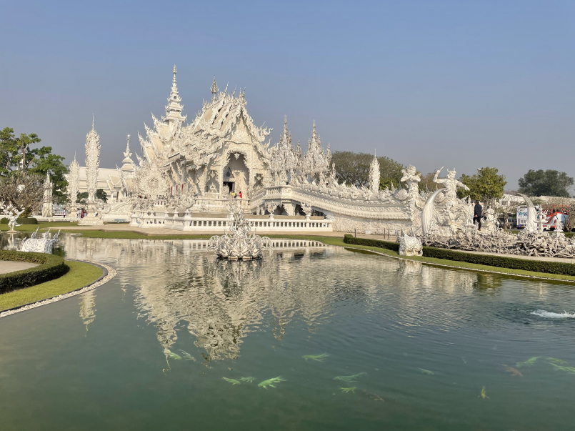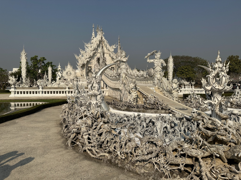 這天我們要離開清萊回到清邁,內心有些不捨,我會記得這裡的純樸還有這間五星酒店的,途中上我們先去參訪白廟也稱白龍寺,潔白神聖的外觀非常漂亮,現場看那種華麗耀眼的雕刻更是令人震撼,據說白廟的建造是有勸人棄惡為善,進入主建築前必需經過這條參拜橋,兩旁有成千上萬的救贖之手,橋是單行不能回頭的,走過奈何橋便意味著由地獄走進天堂,這裡真的每個角落,每個細節,處處都是美景。