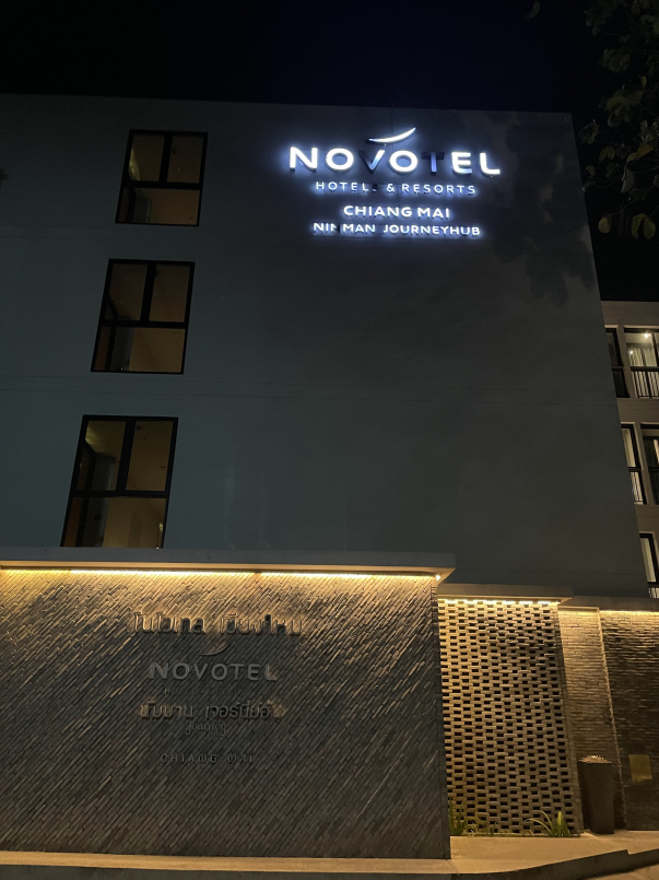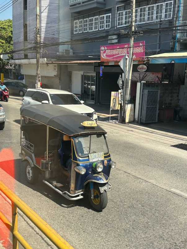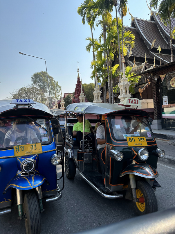 最後我們搭著嘟嘟車遊清邁古城區後,便前往今日住宿點Novotel Chiangmai Nimman Journeyhub入住,今天搭嘟嘟車的感覺和昨晚在清萊不太一樣,這次是所有團員一塊搭,由於是兩人一部,所以沿路上就有好多台嘟嘟車同行,彷彿卡丁車在競賽一樣,讓我印象很深刻,也是蠻難得且有趣的畫面。團員幫忙拍的照片