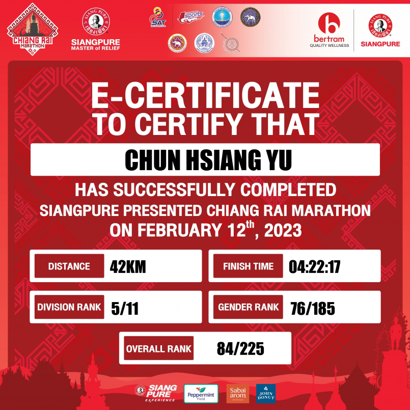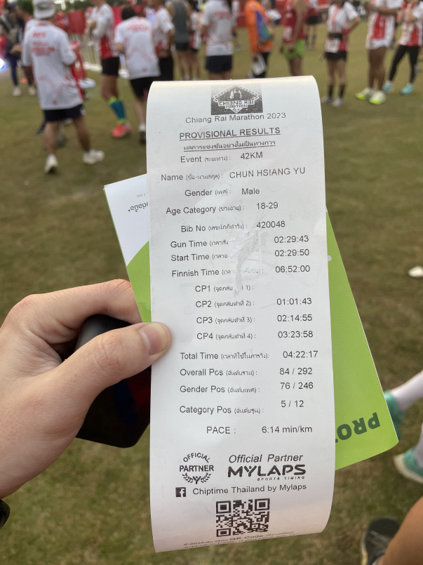 謝謝泰國也謝謝清萊,受到疫情影響感覺得出來參賽人數不多,但整場賽事卻小而美,很能感受到主辦的用心,並沒有因為報名人數不多而忽略了一些細節,這也是我疫情後的海外馬拉松首站,這次用充足的訓練量,站上全馬起跑點來檢視自己的一切,跑出佳績留下美好的回憶,平安順利的創下PB很感動也很興奮。