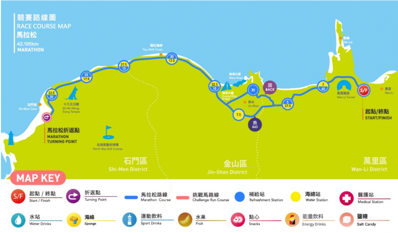今年的萬金石馬拉松路線和去年一樣是新的路線,往年大約6K的時候要右轉爬上金山青年活動中心,回程再爬回來,今年大會很佛心的將去程的爬坡取消了!減少了爬坡的辛苦,更能創造自己最佳紀錄,一起加油跟好跟滿。