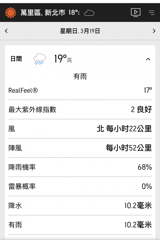 當天新北市萬里區的天氣預測約為18度左右,下雨機率為68%