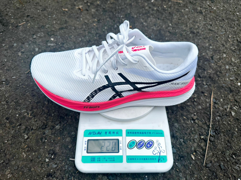 MAGIC SPEED 3 的重量是令我最驚豔的,拿到鞋子一瞬間只感覺到這雙鞋子也太輕了吧!實際拿磅秤一量 US10號 的鞋竟然只有 220g,相較前兩代直接減少了將近 20g,完全超越它牌同等級 競速厚底鞋款,是一個非常有感的升級。