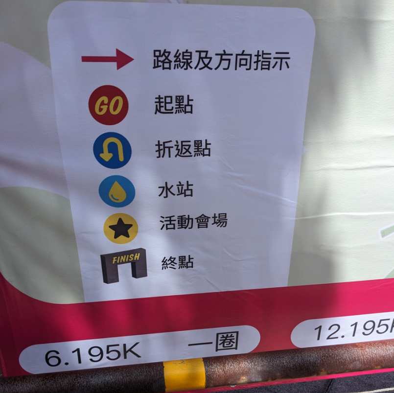 三、賽道繞行彎處標示不清,不少跑者邊跑邊問往哪裡跑,問得還不是賽道志工,而是跑者(因為太陽豔照,賽道志工都在樹底下遮蔭),甚至還有跑者跑錯路線,我就是其中一位,得回頭返回正常賽道。我在第6圈及第7圈連續兩圈跑錯賽道,該跑彎道時卻直行向前,發現不對後又折返,為什麼會連續發生相同的錯誤呢?都是低頭惹的禍!因為高溫曬得我昏頭轉向,也累得快趴了,只能靠意志力撐著,低下頭來且搖頭晃腦,因而錯跑路線。