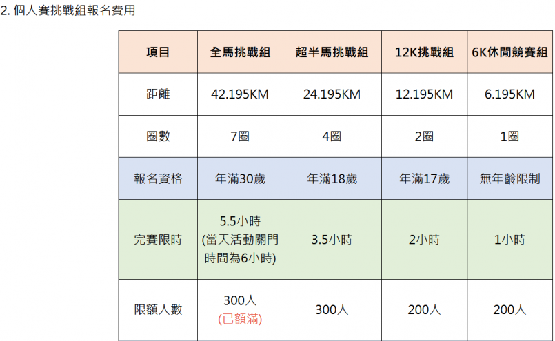 二、簡章載明「全馬挑戰組(個人)」全程42.195公里,繞行國體大田徑場外環道共計7圈,本組僅提供年滿30歲至65歲以下男女跑者報名(名額有限,300名),這是少有的年齡限制且為坡道賽道的繞圈賽,完賽時間更是比一般賽事6小時30分還少1小時,5小時30分完賽(關門時間為6小時),再者,實際賽道距離是一圈6.195K,跑7圈,全程總計43.365K,比全程馬拉松的42.195K還多,是為超馬賽事,依我這不算咖的跑者而言,只能拼跑「關門馬」,也就是大會規定的6小時關門時間內完賽。
