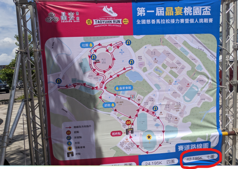 ▲沒有廁所的標示 | ▲跑7圈,不過不是42.195K,而是43.365K |