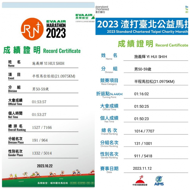 有了這樣的信念,在復跑後11/12的第二場半馬《渣打臺北公益馬拉松》,心情反而更輕鬆了,除了順利完賽之外,左腳底的足底筋膜炎也沒有在比賽中發作,而且成績居然又比長榮半馬進步了3分鐘。能夠有這樣的結果,大大出乎我的意料之外。